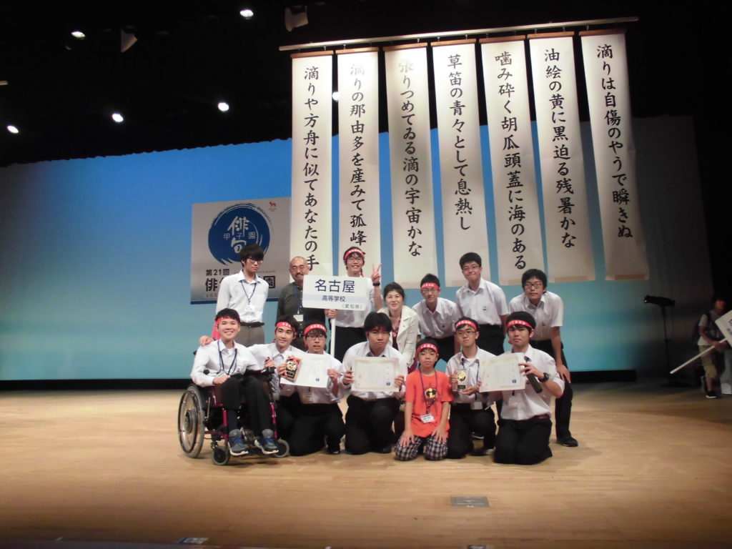 地方大会を敗退し、投句審査を経て、五年連続の全国大会への舞台へ上がりました。予選リーグでは海城高校・水沢高校・筑紫丘高校と対決、水沢に1敗を喫したものの海城・筑紫丘を破り、結果、リーグ2勝1敗と水沢高校に並びましたが、直接対決の結果が優先となるルール上、予選リーグで惜敗をしてしまいました。しかし、敗者復活戦(40分以内に与えられた兼題「水鉄砲」で句を作り、審査員13人から次々と質問を受けるもの)では、牛田君の〈青空に満ち干ありけり水鉄砲〉が1位となり、2日目の舞台に立つことができました。ただ、その後の決勝リーグ(名古屋高校・徳山高校・済美平成)において、済美平成に勝ったものの、徳山に鑑賞点1点で敗れ、残念ながら決勝戦へは進めませんでした。久々の2日目に返り咲いた名古屋高校文学部、入選2句は初めての快挙です。今後は、今回参加した2年生・1年生が、この後どのように育つのかが、一番大切な部分となります。