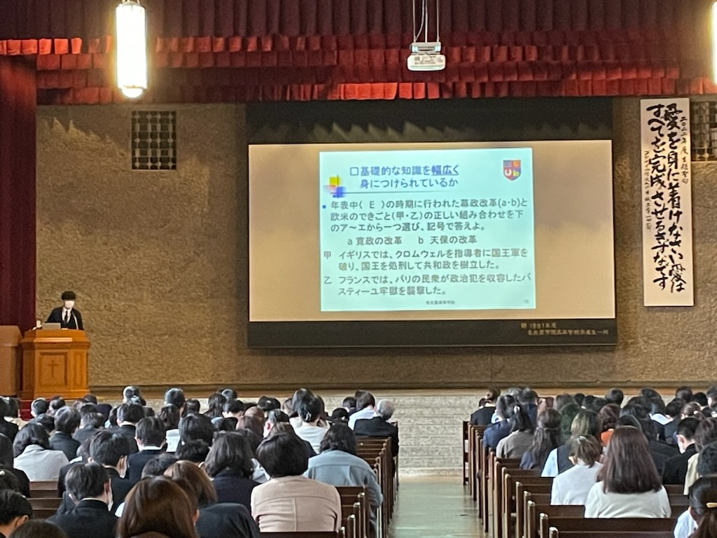 11月26日(土)、明け方の雨も止み、暖かさが感じられる中、第2回名古屋高校説明会「入試対策説明会」が行われました。2023年度入試説明ののち、各教科担当者が直接受験生に向けて、入試のワンポイントアドバイスを送りました。今回は、生徒会四役・執行部による個別相談会を開催しました。今回の説明会も多くの皆様に御来校いただき、誠にありがとうございました。