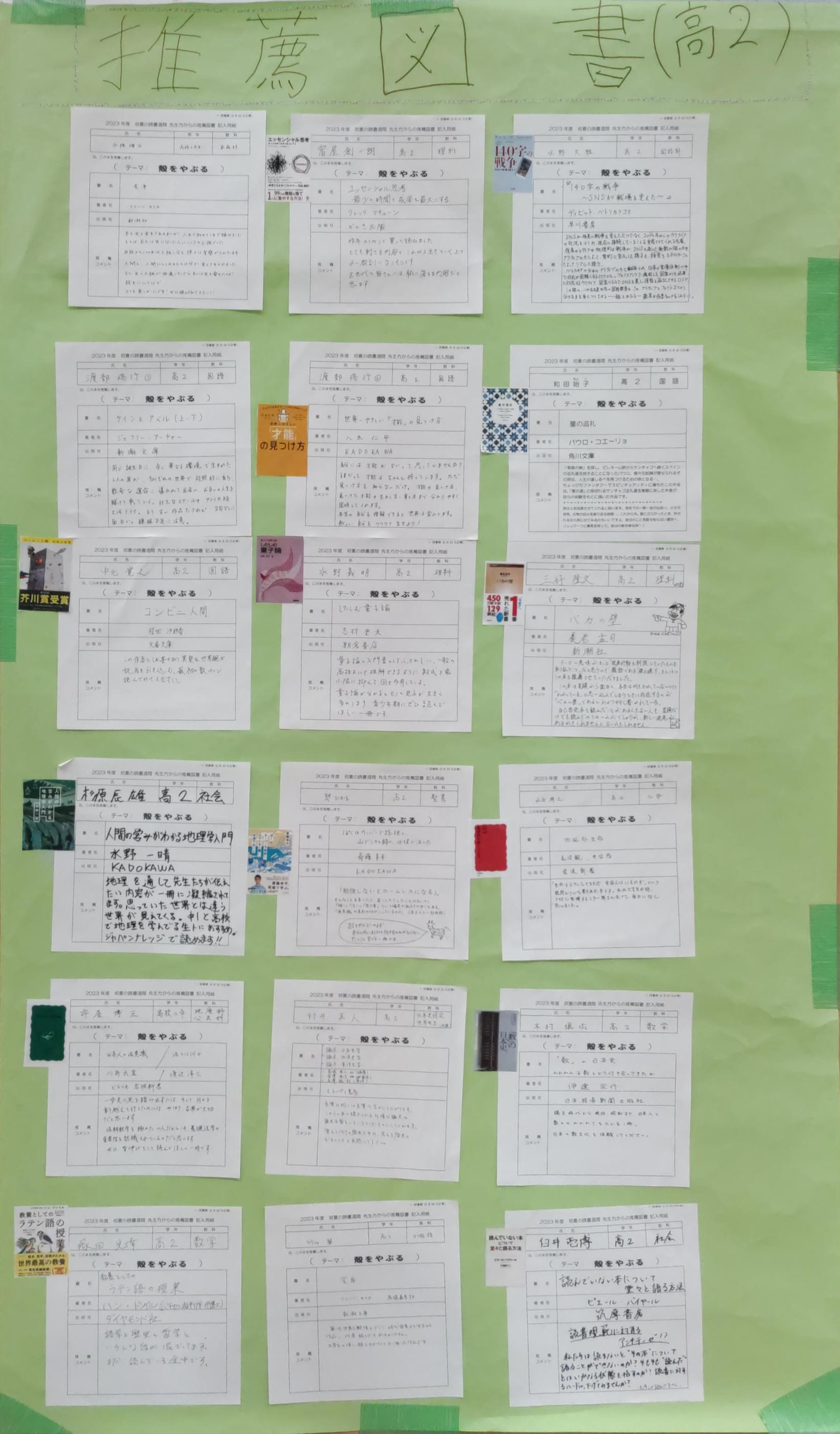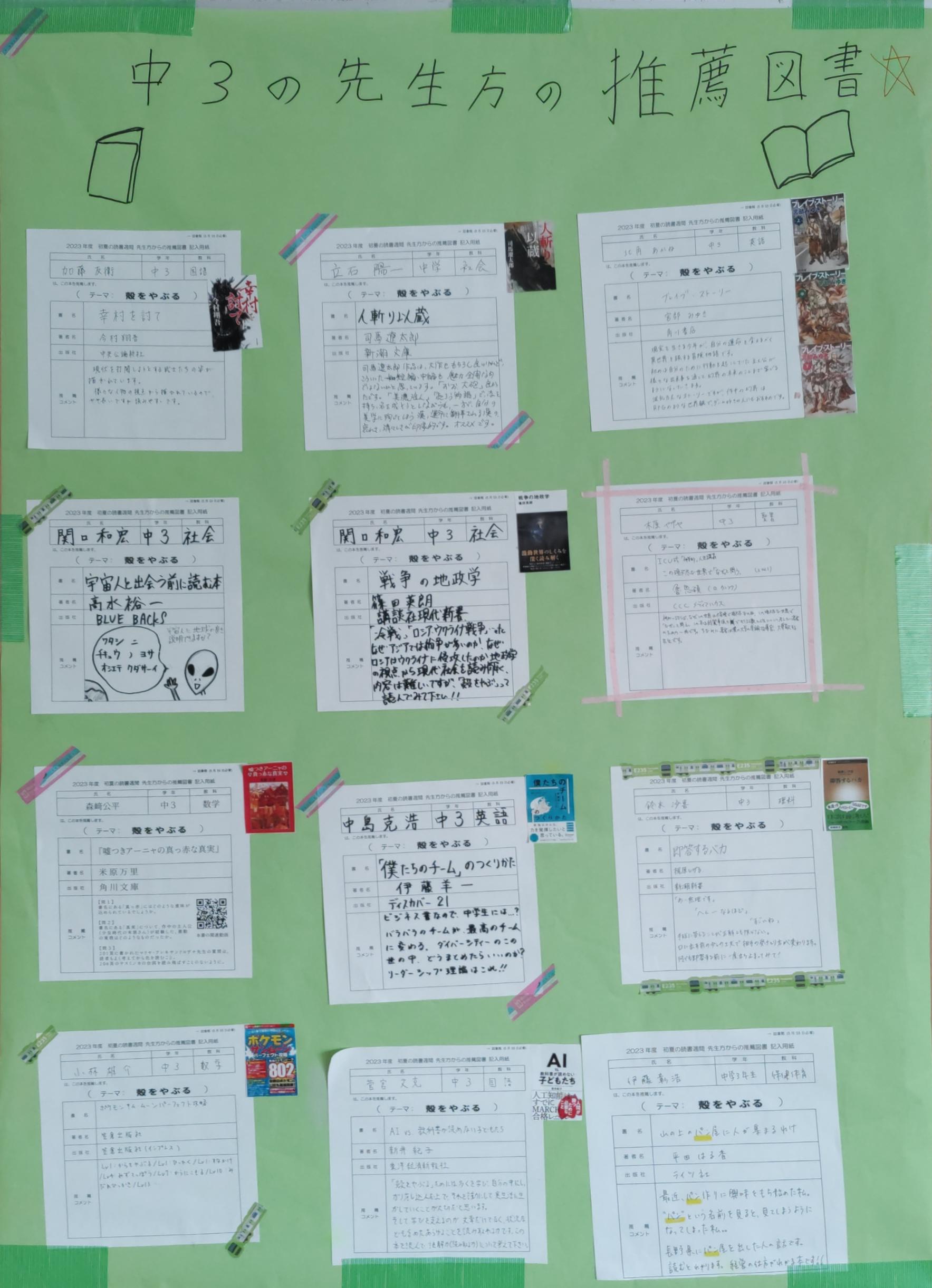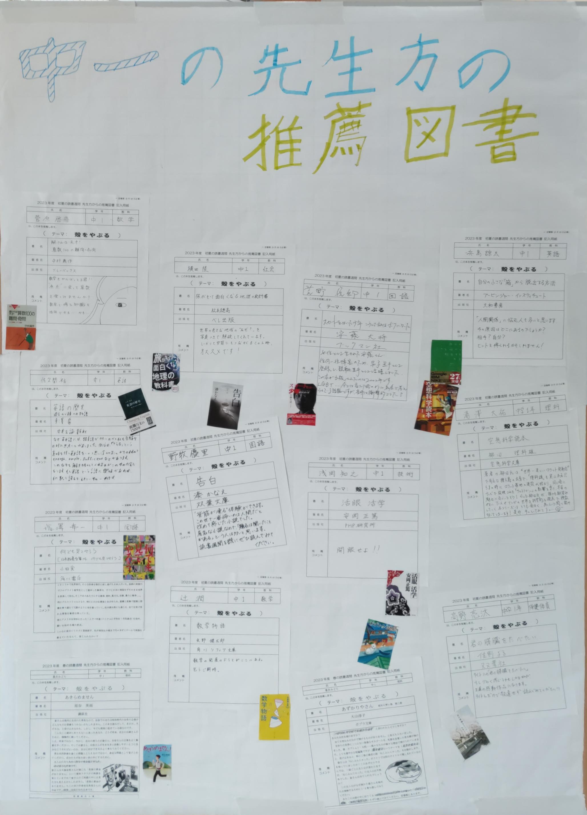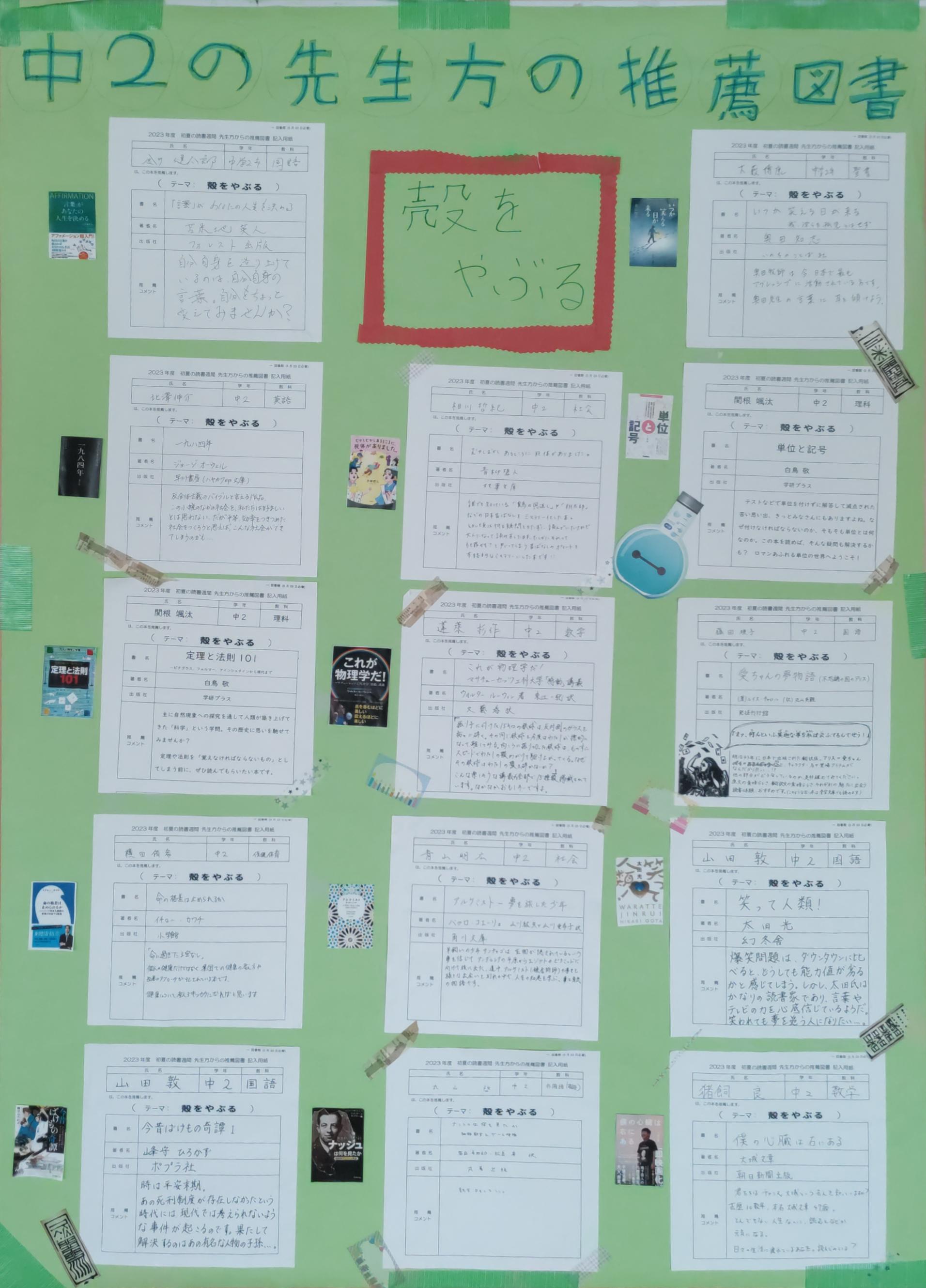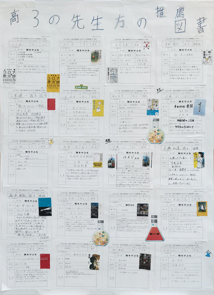 学年の先生たちからの推薦図書もエントランスに掲示しています。