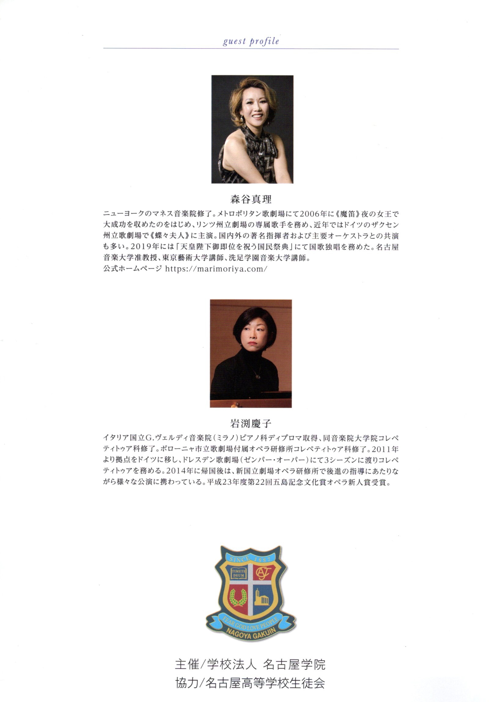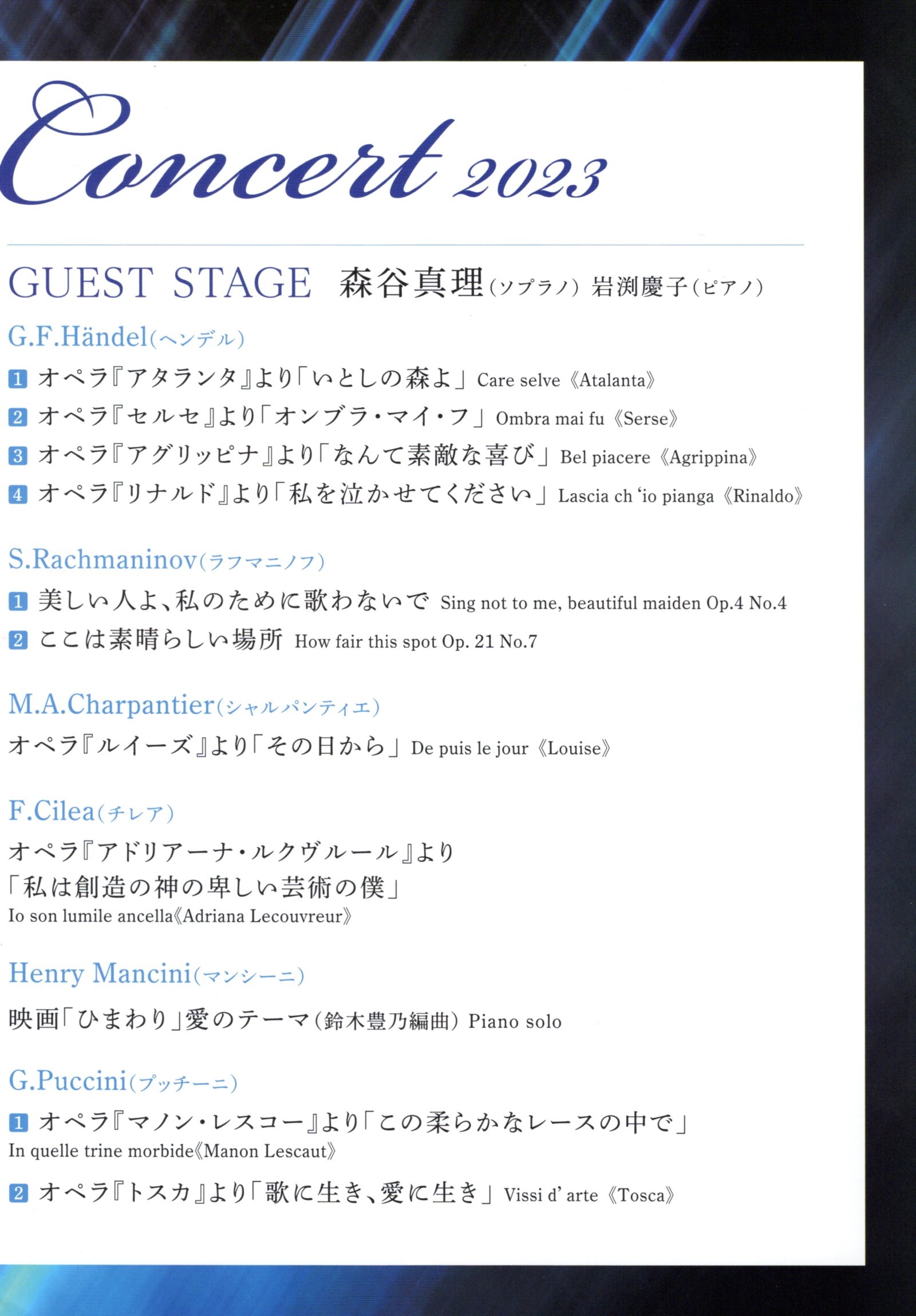 第二部はゲストにソプラノ歌手の森谷真理さん、ピアノの岩渕慶子さんをお迎えしての演奏をお聴き頂けます。