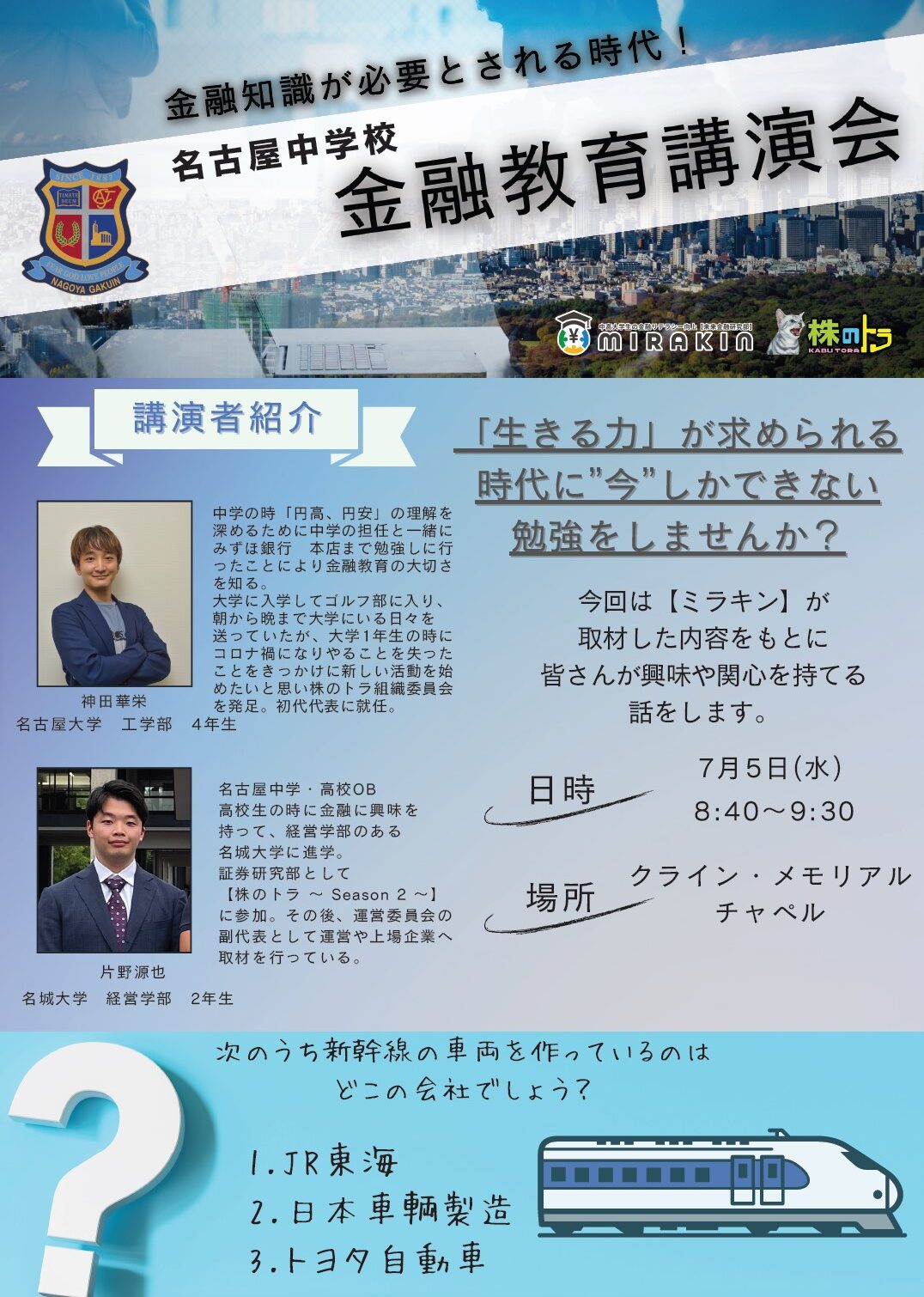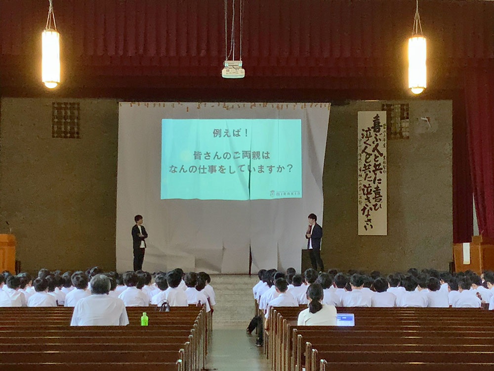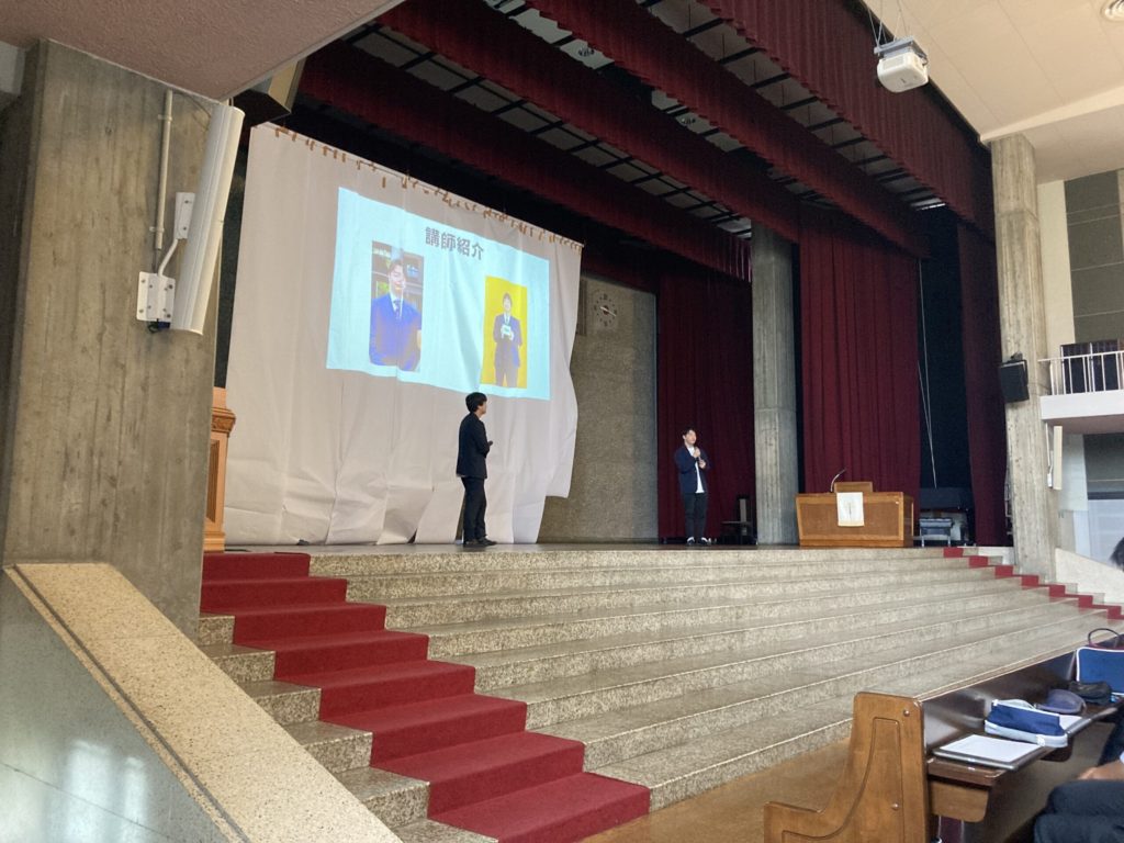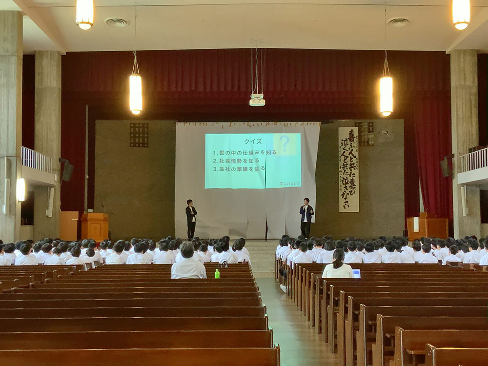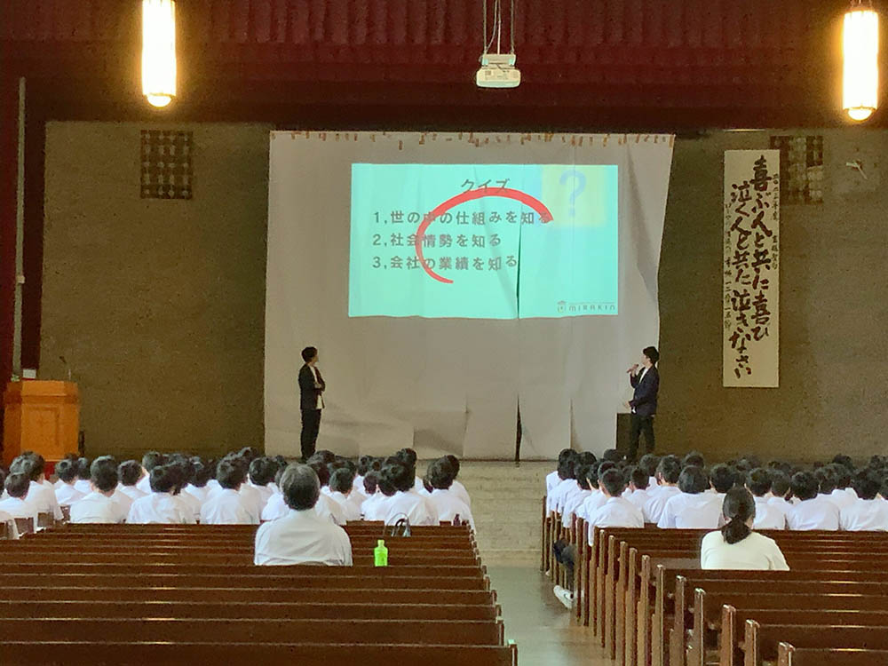 他人事になりがちな「公民分野」の「金融」について本校OBの片野源也さん(名城大学2年生)と未来金融研究部代表の神田華栄さん(名古屋大学工学部4年生)が講演をしてくれました。