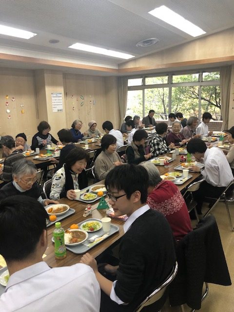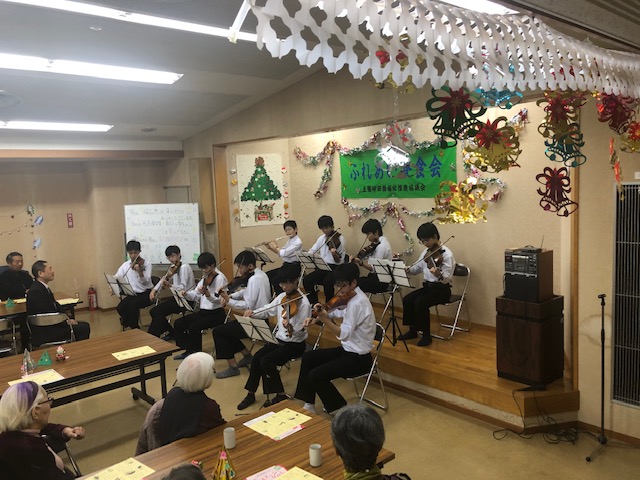 2019年12月18日(水)今年も砂田橋会館で行われたクリスマス昼食会にオーケストラ部の生徒が参加しました。砂田橋学区の独り暮らしの高齢者の集いの場として毎年行われています。東区社会福祉協議会の方や砂田橋小学校校長がサンタクロースに扮してプレゼントを配り、本校オーケストラ部がクリスマス讃美歌を演奏、そしてみなさんで讃美歌を歌いました。その後、カレーライスをいただき、なごやかなひと時を過ごしました。近隣に住む高齢者の方々の健康を祈ります。