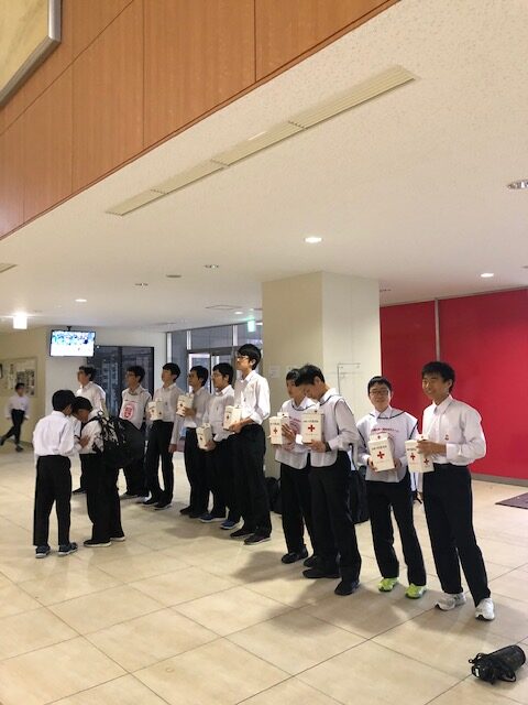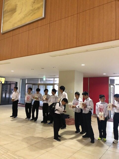 高校生徒会を中心に台風19号災害義援金の呼びかけを行いました。10月24日、25日の昼休みと放課後に1階エントランスにおいて、高校生徒会、減災チーム、JRC部員が集まり、募金を呼びかけました。通りかかった沢山の中学生、高校生、教職員が募金をしてくれました。合計で22,019円が集まり、日本赤十字愛知県支部に届けてきました。災害によって苦しんでいる方々の上に、神様の慰めがありますように祈ります。