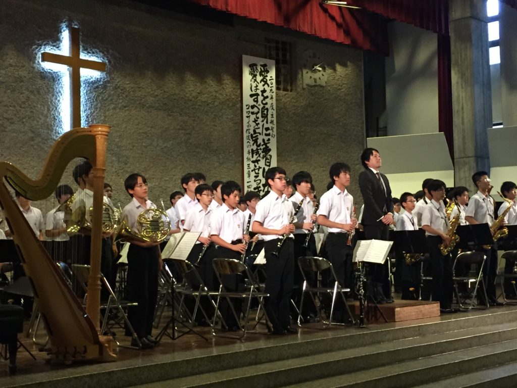 聖歌隊、クラインズ・シスターズ、オーケストラ部、吹奏楽部が日頃の成果を存分に発表した後、後半はバス歌手の森雅史さん、ピアノの岩渕慶子さんによるゲストステージ。武満徹の「死んだ男の残したものは」は森さんの深く暗い歌声が戦争の悲惨さを語り、強い印象を残しました。