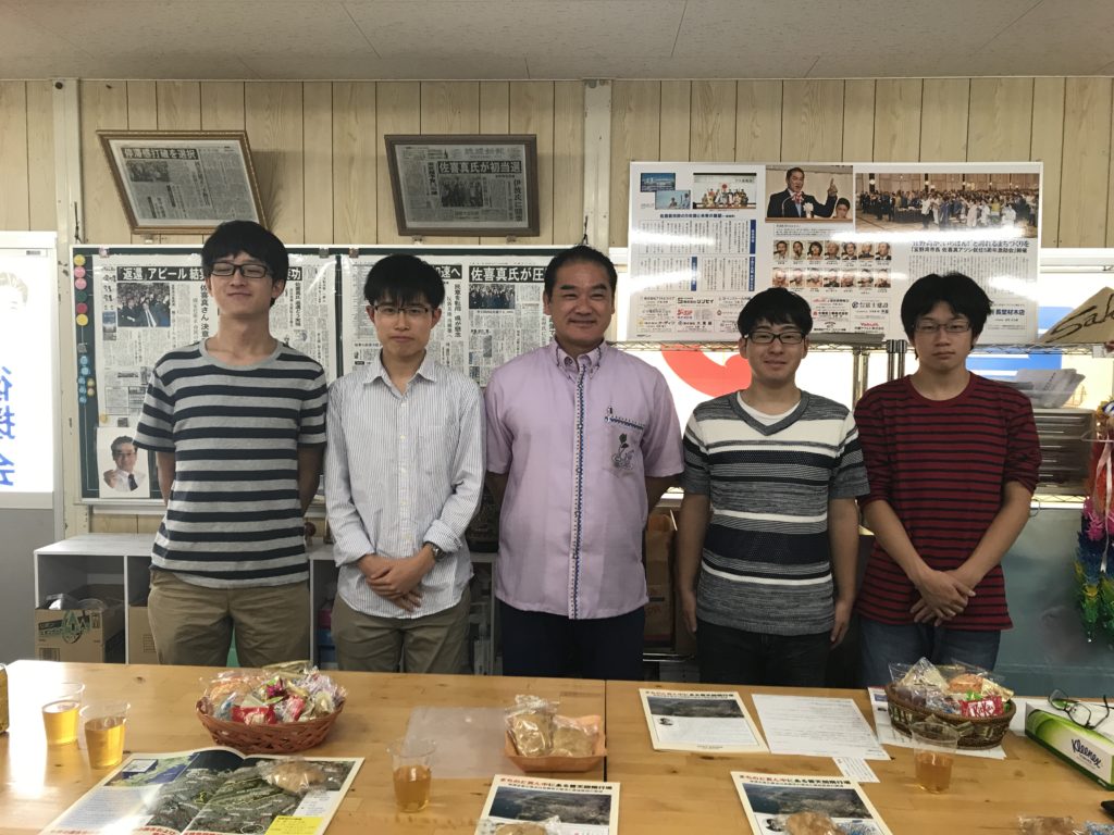 高2沖縄修学旅行の初日タクシー研修にて、高2D組の永戸くん・野上くん・長谷くん・藤井くんグループが、沖縄県知事選の立候補者である佐喜真淳さんと渡口初美さんのもとを訪れ、インタビューをおこないました。生徒自身が自らアポをとり、事前に質問項目をFAXするなど主体的に計画し、実現することができました。お忙しい中にもかかわらず快く対応してくださった佐喜真さんと渡口さんに感謝いたします。大変ありがとうございました。