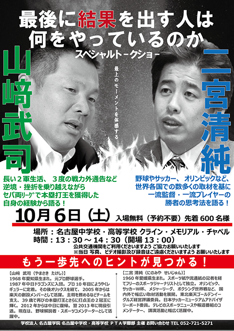 「最後に結果を出す人は何をやっているのか」と題しまして、山崎武司・二宮清純 両氏によるスペシャルトークショーです。皆様お誘い合わせの上、ご参加下さい。
