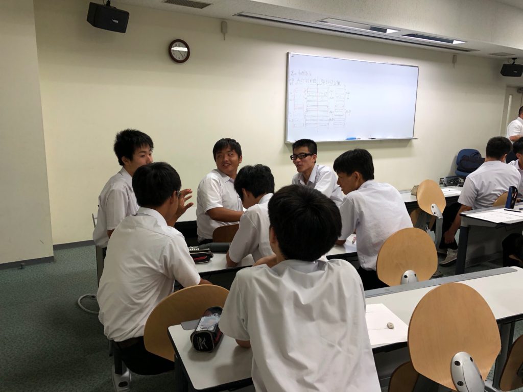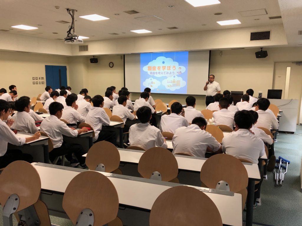 名古屋税理士会・名古屋東支部より本校OBである溝口雅久先生をはじめとする3名の税理士さんに来ていただき、「消費税増税に賛成か反対か」をテーマに講義をしていただきました。その上で、グループでディスカッションをし、意見をまとめて全体で発表し、共有しました。活発な議論が展開されて、税に対する理解を深めることができました。講座の最後には質疑応答や、税理士ってどんな仕事?といった現職の税理士さんならではの貴重なお話を聴くことができました。本校の社会科では、中学3年生と高校2年生で租税教室を実施しています。