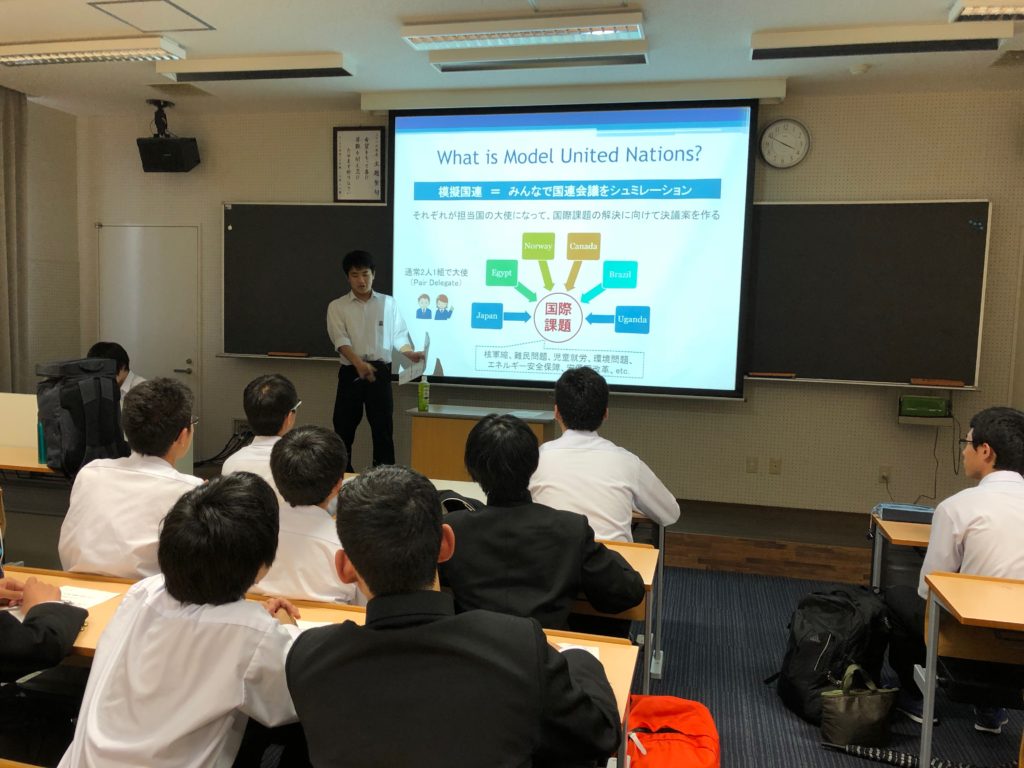 SGH活動 「模擬国連」説明会 本校ではSGHに関連する取り組みの1つとして、模擬国連の活動をしています。5月2日(水)、模擬国連に興味関心のある中1~高2の生徒が集まり、模擬国連の説明会を実施いたしました。説明を担当するのは、昨年度、全日本高校模擬国連大会に出場した生徒です。昨年度、高1の2ペアが書類審査を通過し、全日本高校模擬国連大会に出場いたしました。模擬国連とは何か、模擬国連から何が得られるか、に関する、自身の体験を交えながらの説明に、集まった生徒は熱心に耳を傾けていました。 投稿日: 2018年5月10日 (2023年5月10日) 投稿者: %s meigaku カテゴリー: 探究活動・SGH、高等学校 2018天体観望会のスケジュール 7月14日(土)名古屋学院サマーコンサート