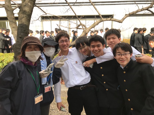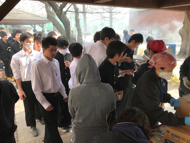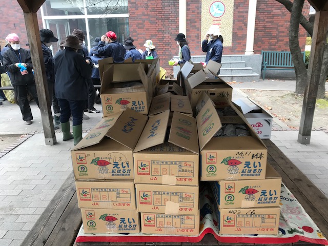 用意しておいた150キロの焼き芋は30分足らずで配布完了。たくさんの歓声と笑顔が校内に溢れました。