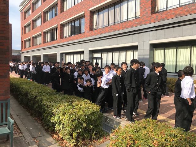 前日の10日(日)は、洗ったサツマイモを新聞紙で巻き、水で濡らしてからアルミホイルで包む、といった準備が入念に行われました。当日は、事前に集めておいた落ち葉で焚火をし、サツマイモをじっくりと焼き上げました。昼休みには、アツアツの焼き芋を求め中高生の長蛇の列が!!