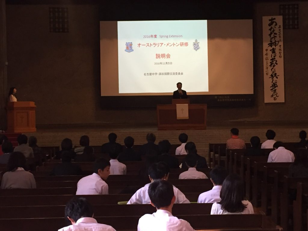 スプリング・エクステンション説明会が行われました 3月下旬に実施されるスプリング・エクステンションの説明会が行われました。春のエクステンションは本学の兄弟校メントン・グラマー・スクール(豪州メルボルン近郊)においてホームステイで行われます。 プログラムにはタンガルーマでの自然環境学習も入っていて、英語をアウトプットするだけでなく、ESDについての学びも深めることができる内容です。 チャペルで行われた説明会には多くの生徒・保護者の皆様に参加いただきました。 投稿日: 2016年11月8日 (2023年5月11日) 投稿者: %s meigaku カテゴリー: 国際交流 大学入試説明会について 中学オープンキャンパスへのご参加ありがとうございました