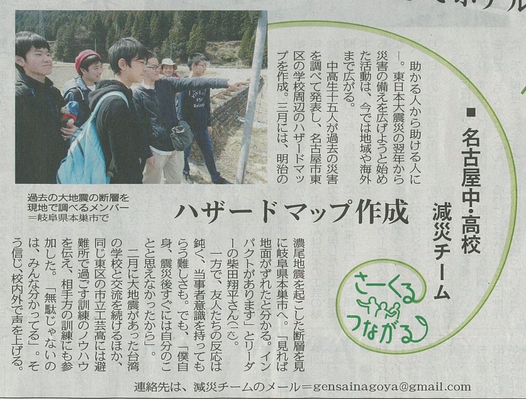 この減災チームの活動については、昨日2016年4月19日の中日新聞夕刊に掲載されました。