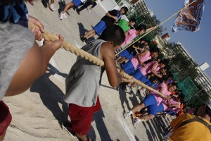 綱引き。掛け声と共に、筋肉から汗が飛び散ります。