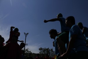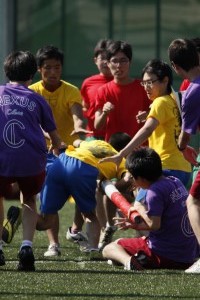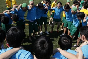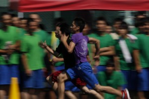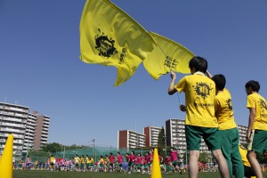 緑の人工芝のなか、応援の旗(クラスごとの自作です)もひらめきます。円陣を組み、盛り上がります。男子校ならではの雰囲気です。クラスの期待を一心に背負って全力を出して走ります。