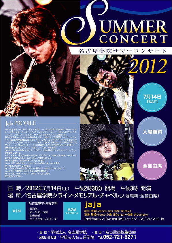 来る7月14日(土)午後3:00より,名古屋学院クライン・メモリアル・チャペルにて名古屋学院サマーコンサート2012が行われます。毎年恒例となったコンサートは年々評判が高まり,入場者数も増えています。今年は第二部のゲストにjaja(じゃじゃ)さんをお招きしました。近頃評判のプロのジャズグループです。レベルの高い演奏をお楽しみいただけると思います。