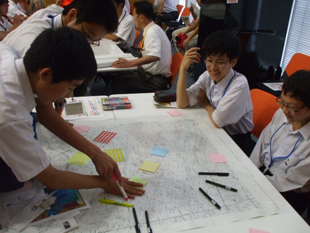 セミナーは夏休み期間中の7月24・25・30・31の4日間、名古屋大学にて行われ、建築学・土木工学・地理学・心理学・地質学など、防災に関連する様々な方面の講義とワークショップを体験して参りました。名古屋の地理的要因・液状化・土砂災害・ボランティアの役割・耐震性能・行政の役割の実際を、名古屋大学の最先端の研究者によりわかりやすく説明してもらうと同時に、NPOや行政の援助を受けながら、自分達の学校周辺のハザードマップ作りや、災害時における人間の心理状態の体験など、ワークショップも体験しました。最後にはこれから2年間、名古屋高校にて取り組む防災のアクションプランを策定し、各学校、名古屋大学の研究者や防災の専門家の前で、プレゼンテーションをし、普段では体験できない、充実した4日間を過ごすことができました。このような学習は一見すると勉強とは離れているとは思われるかもしれませんが、実際は全く逆であり、防災の学習には普段の学習がリンクしているだけではなく、逆に、このような防災の学習こそが、真の「生きる」学習であり、その学習への筋道として普段の学習が有機的に繋がっているということが、今回の「防災セミナー」で理解できたと思われます。