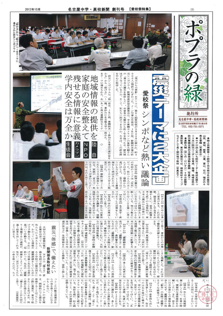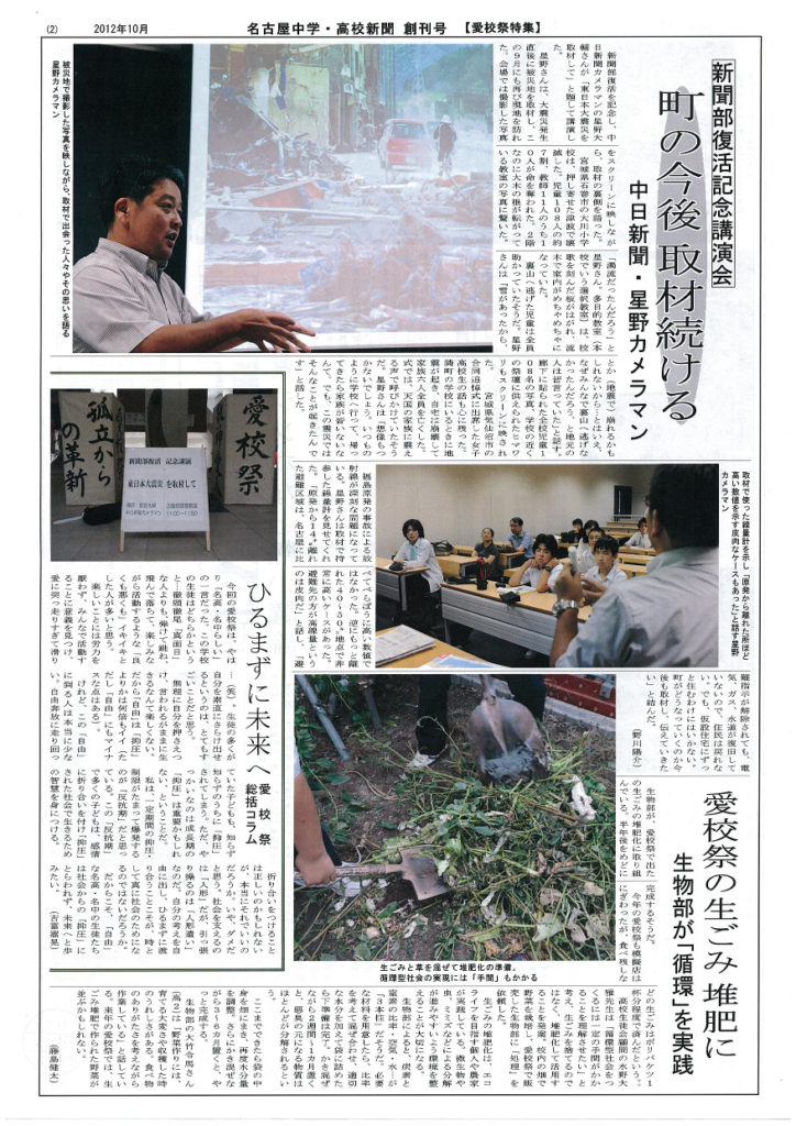 新聞部・創刊号を発行 長く活動を停止していた「新聞部」が、活動を開始しました。学園祭など学校行事の取材を通して、生徒の目から今を考える内容となっています。「今後も定期的に発行する」と部員たちは張り切っています。ご期待ください。 投稿日: 2012年12月1日 (2023年5月13日) 投稿者: %s meigaku カテゴリー: 部活動 10/25中学体育祭が行われました。 3/27オーケストラ部・定期演奏会