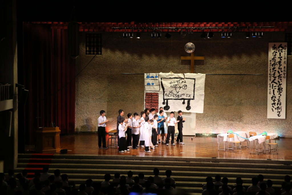 9月21日(土)に高校の愛校祭と同日開催で中学文化祭が行われました。当日は天候に恵まれ多くの来場者で校内がとても賑やかでした。中学校では午前中に、チャペルにて各学年で準備した演劇が披露されました。今年度は昨年度に比べ、各学年、ストーリー、演出など凝ったものが多く、生徒の演技力も高くなっていました。今年度は3学年企画という形で学年の壁を越えて映像を作成し上映しました。3学年が協力した企画があまりなかったのでとても新鮮で、生徒たちも楽しんでいました。