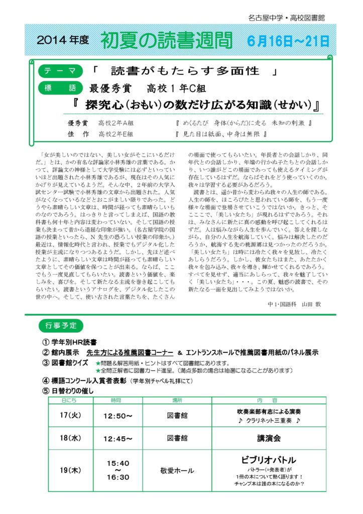 初夏の読書週間が始まりました。 6月16日(月)~21日(土)の期間は、初夏の読書週間です。 テーマは「読書がもたらす多面性」。5月に行われた標語コンクール最優秀賞は『探究心(おもい)の数だけ広がる知識(せかい)』でした。 エントランスホールでの先生方の推薦図書用紙パネル展示や図書館クイズ、図書館における吹奏楽部有志の演奏や講演会、先生vs生徒のビブリオバトルなど様々な行事が予定されています。 投稿日: 2014年6月5日 (2023年5月13日) 投稿者: %s meigaku カテゴリー: 学校行事 名古屋中学校 球技大会が行われました 最先端の研究を味わう~年代測定センター訪問~