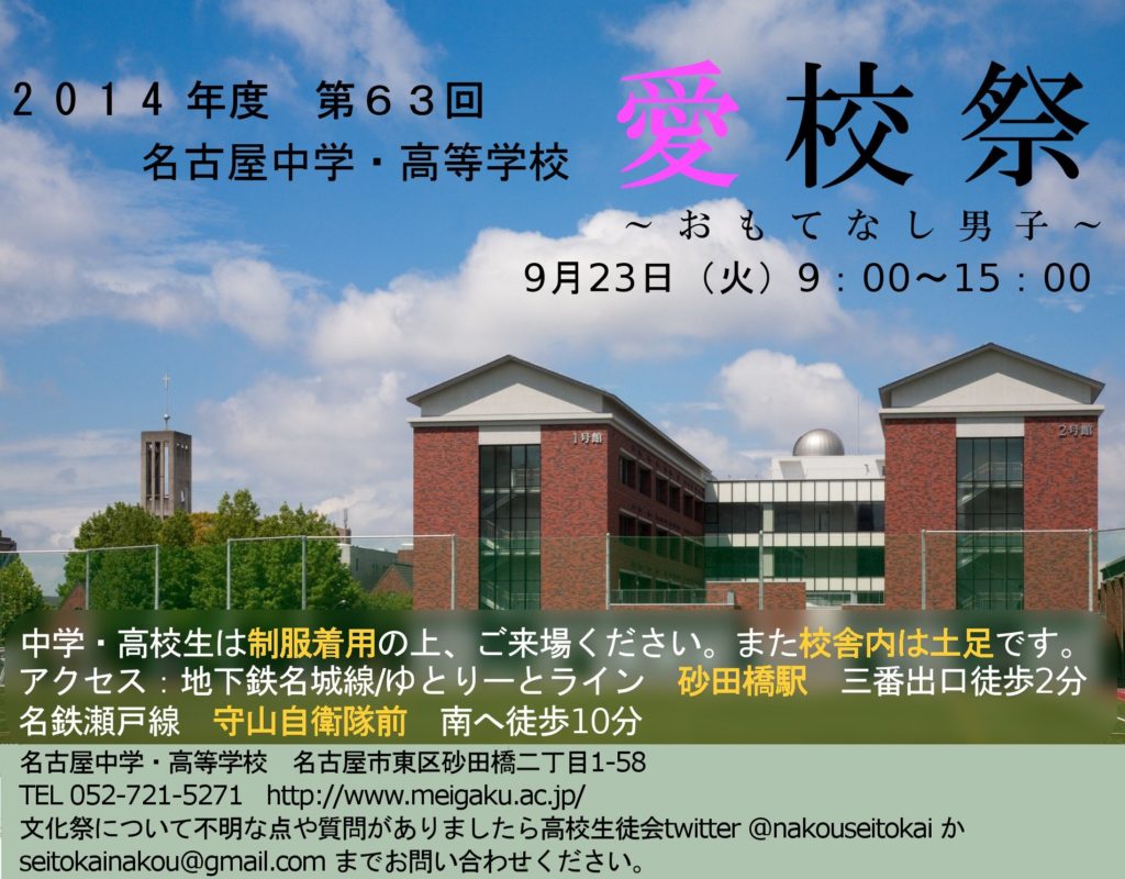 第63回となる名古屋中学校・高等学校の文化祭「愛校祭」。今年は「おもてなし男子」をテーマに皆様をお迎えいたします。