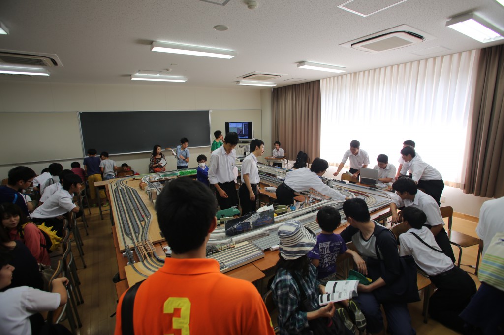 鉄道研究会はジオラマと模型運転。子ども達に大人気。