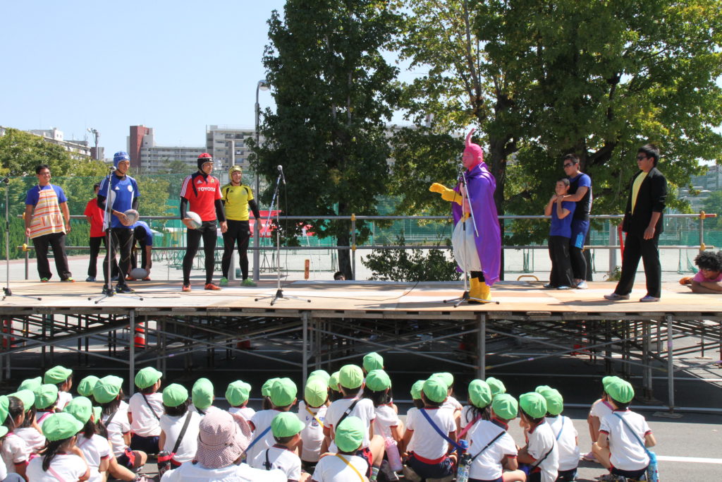 同じくラグビー部の保育園向け寸劇から。1日目、ラグビーレンジャーが魔人を倒しました。