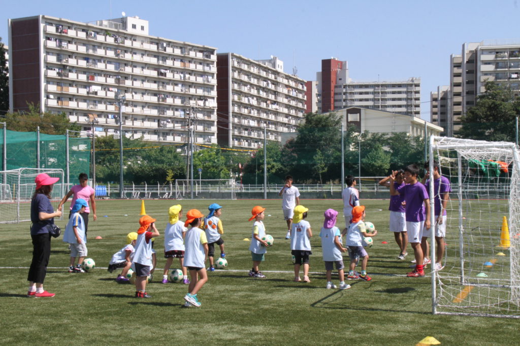 サッカー部は保育園・幼稚園の幼児にサッカーを教えました。自分達のサッカーを鍛えるだけでなく、次の世代にもサッカーを広める実践をしている名高サッカー部。いつもは小学校に教えている部員たちですので、慣れたものでしょう。