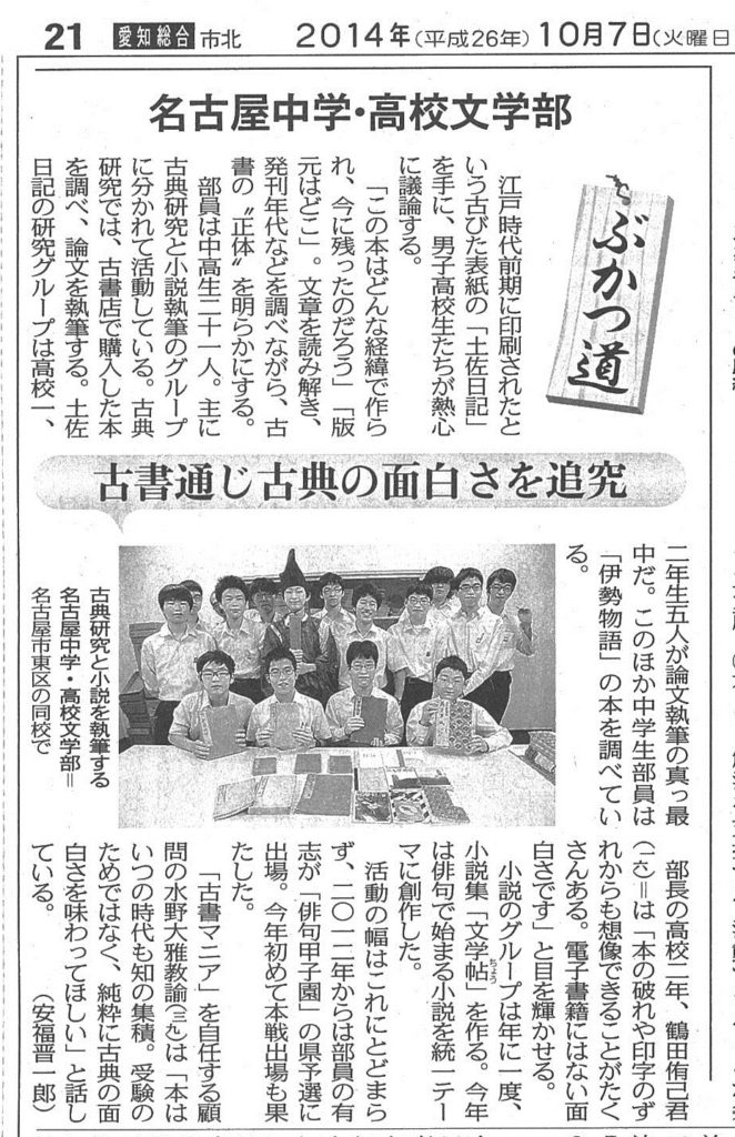 名古屋中学・高校 文学部の活躍-10月7日朝刊 名古屋中学校・高等学校文学部の活躍が中日新聞10月7日の朝刊「ぶかつ道」に掲載されました。 投稿日: 2014年10月7日 (2023年5月13日) 投稿者: %s meigaku カテゴリー: 部活動 天体観望会が行われます 11月1日(土) ポプラの緑 愛校祭特別号