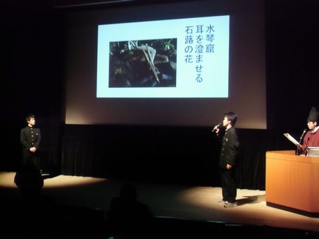 東区小劇場で行われたこのイベントでは、ホールの中での多くの方々の前での発表でもありましたが、名古屋中高生たちは、物怖じすることなく、身振りをりようしたり、俳句鑑賞の実演をはさんだりと、創意工夫をこらし、自分たちの活動をアピールしておりました。