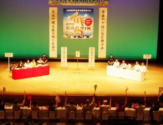 兼題は秋雨・蜻蛉・残暑の3本勝負。優勝旗を前に高校生の感性あふれる俳句と激しいディベートが展開されます。