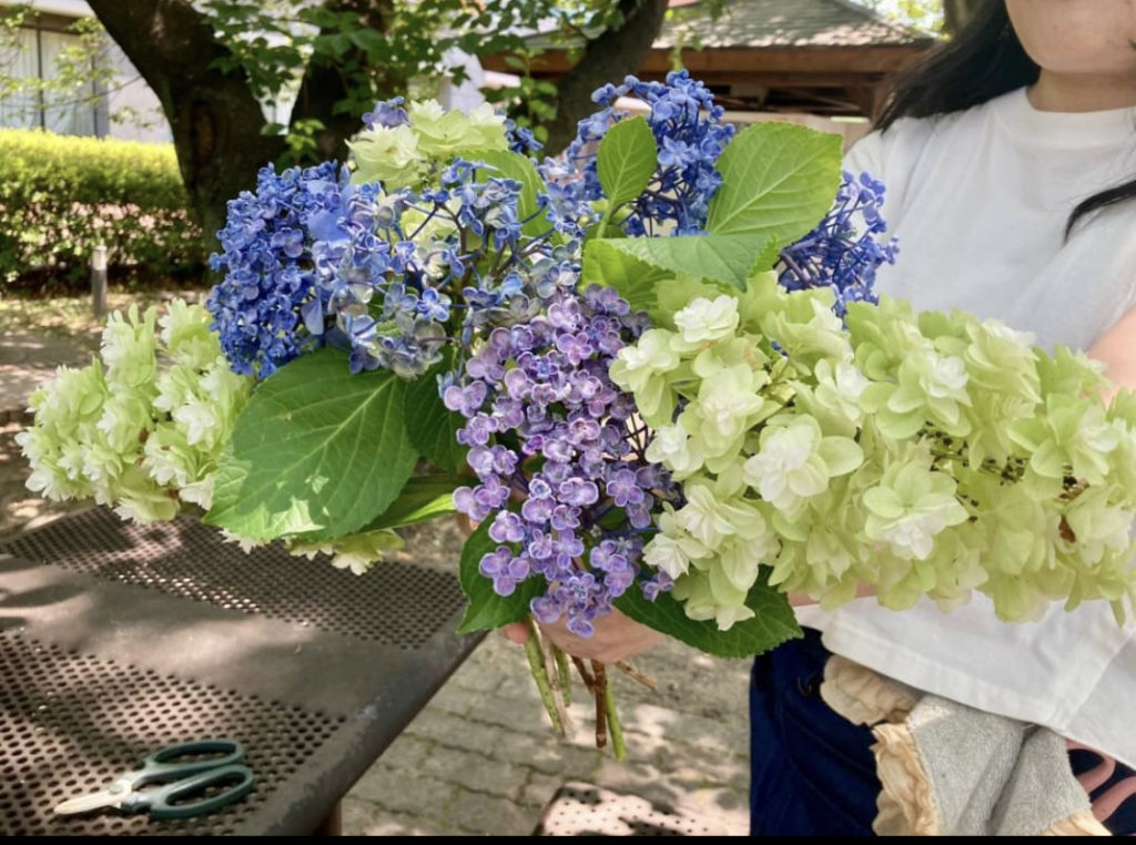 お花に癒されて元気に 5名のメンバーでお花のお手入れをしました。 事務所前のハイビスカスと新高山ホールまわりのバラに蕾が♩ 咲くのがとても楽しみです。 事務所に剪定したアジサイが飾られています。 暑い日が続いてゲンナリしますが、お花に癒されて